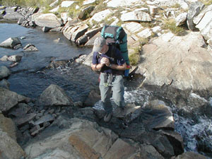 We got an Early start leaving camp at 6 AM. We hiked gently uphill for miles along a wonderful granite ledge and eventually lost precious altitude by descending into a canyon. We went down to 8000 feet.